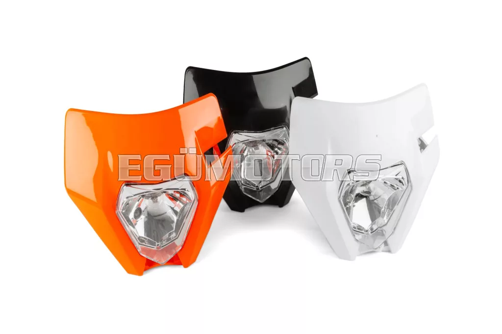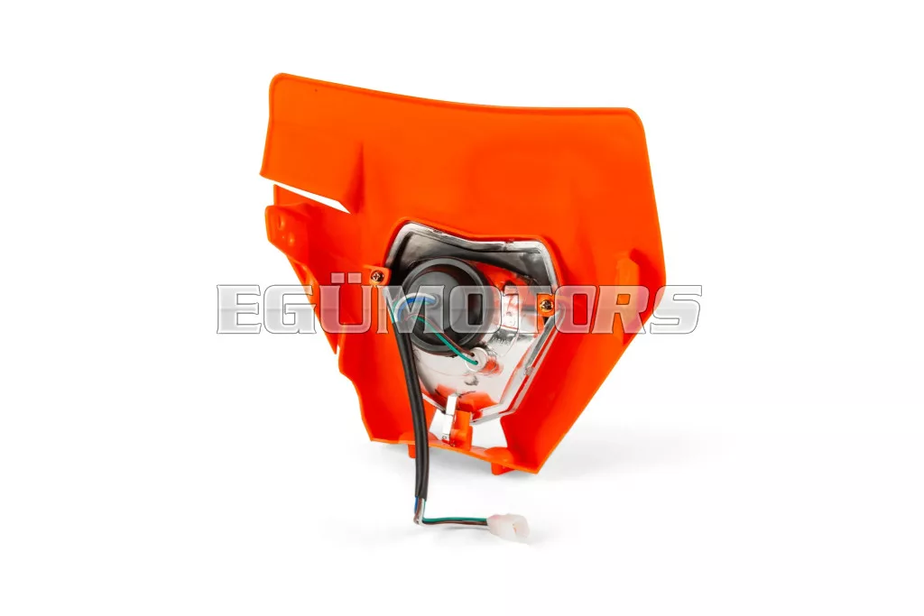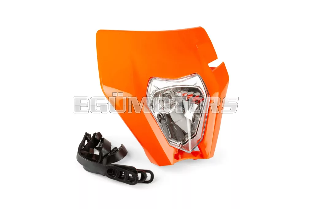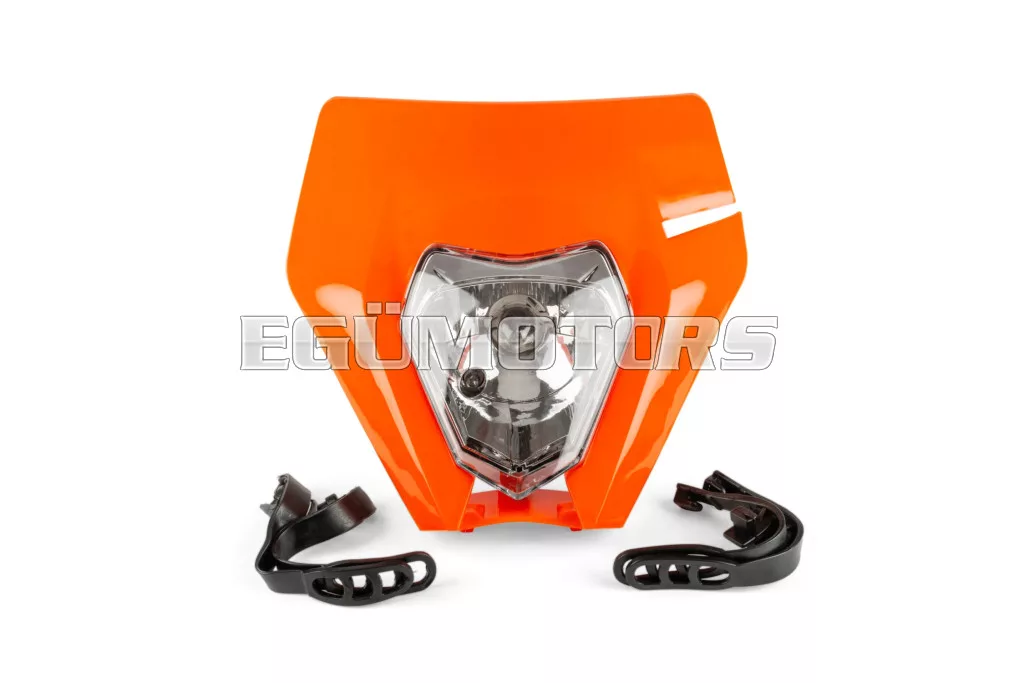 Első fényszóró KTM EXC típus, narancssárga, 2020 utáni modellekhez, felszerelhető 50cc-es motorokra, supermoto és enduro motorokra, illetve egyéb kétkerekű járművekre.