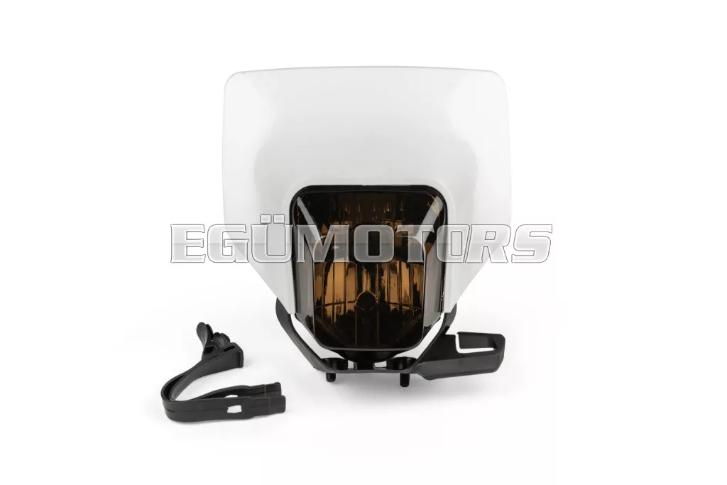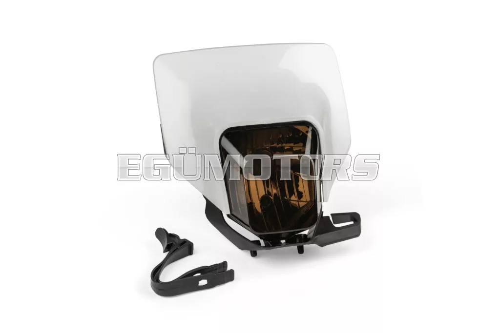 Husqvarna FE / TE típusú fényszóró burkolat sötétített üveggel, 50cc-es motorkerékpárokhoz, motocross, supermoto, enduro vagy egyéb kétkerekű járművekhez történő felszereléshez.