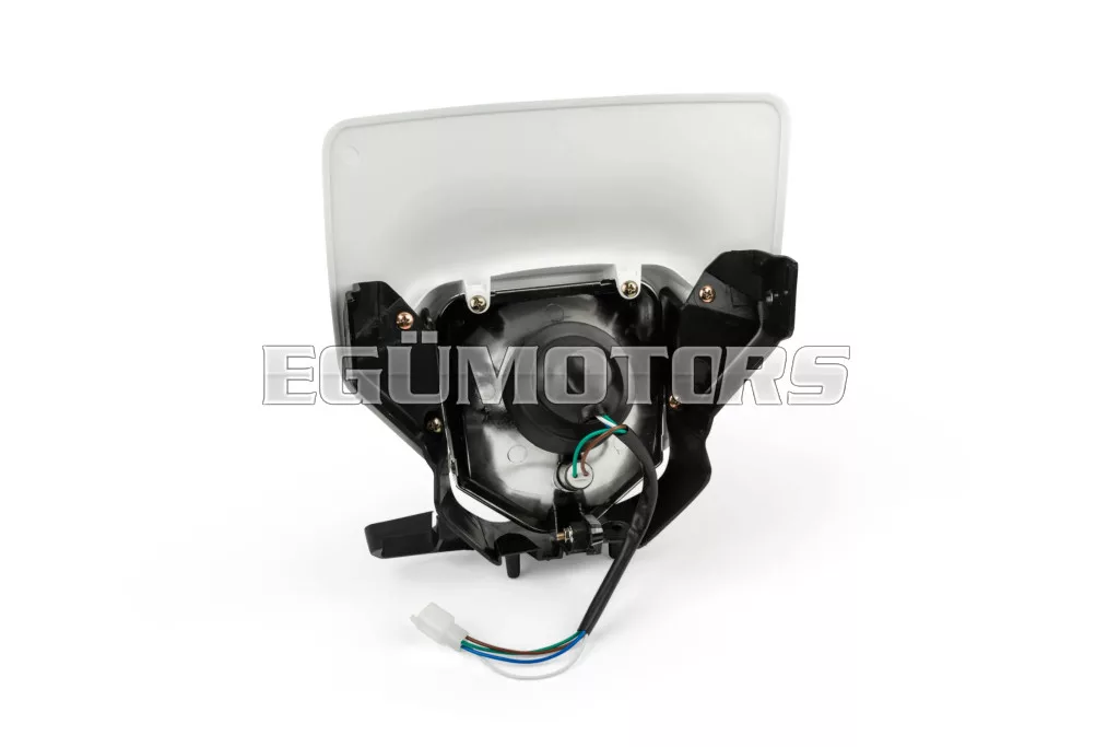 A lámpaburkolat egyszerű kialakítású és kiváló minőségű kidolgozású, motorod sportos, Husqvarna stílusú MX megjelenést kap. A fényszóró az eredetihez hasonlóan halogén izzóval kerül szállításra.