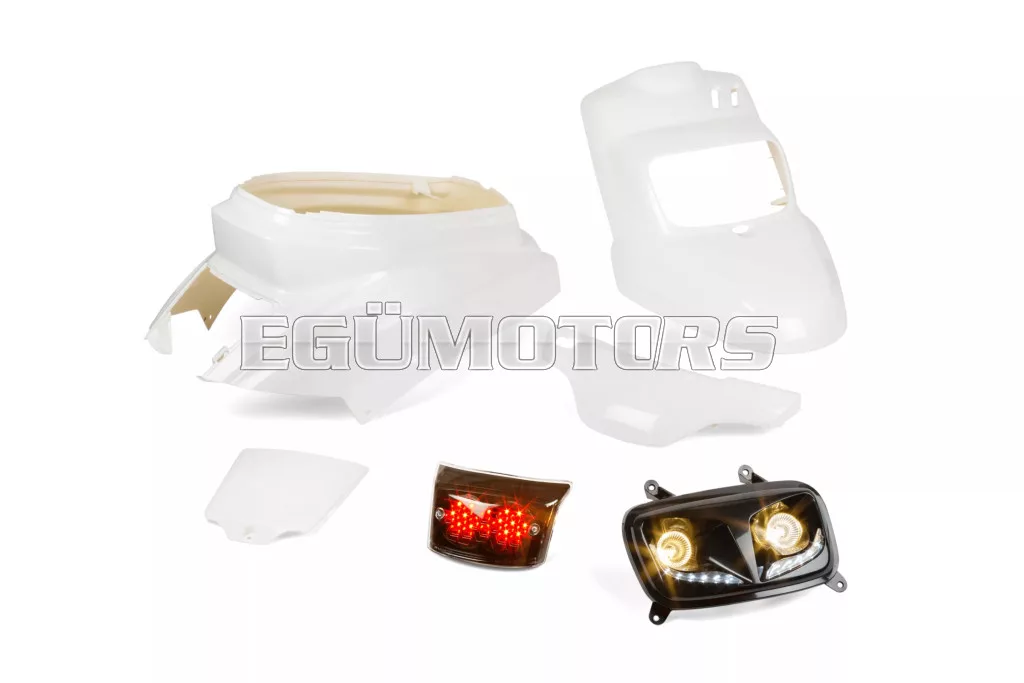 Az idomkészlet 4 fehér színű elemből áll (fényszórómaszk, kormányburkolat, motorburkolat és hátsó idom).