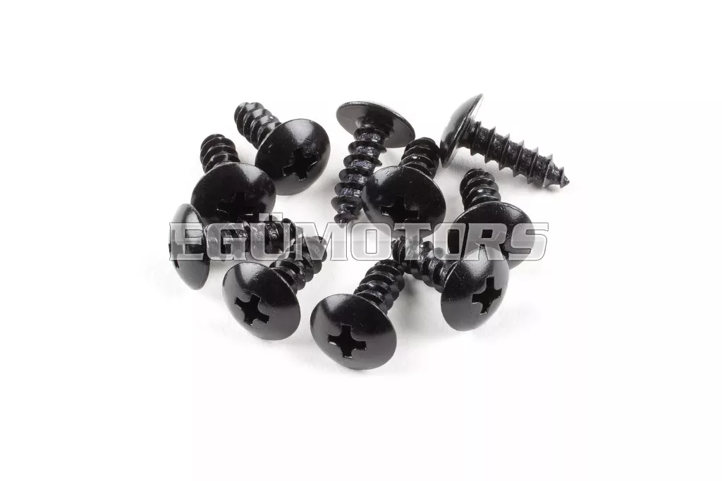 Kiváló minőségű, fekete színű alumínium önmetsző csavarok idomok rögzítéséhez. Ideális megoldás a burkolatelemek biztonságos felfogatására, miközben egy kis optikai tuningot is ad a motor vagy robogó megjelenéséhez.