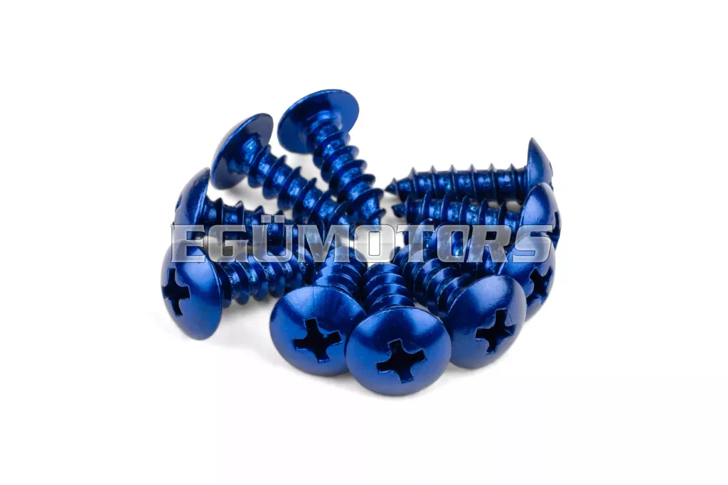 Kiváló minőségű, kék színű alumínium önmetsző csavarok idomok rögzítéséhez. Ideális megoldás a burkolatelemek biztonságos felfogatására, miközben egy kis optikai tuningot is ad a motor vagy robogó megjelenéséhez.