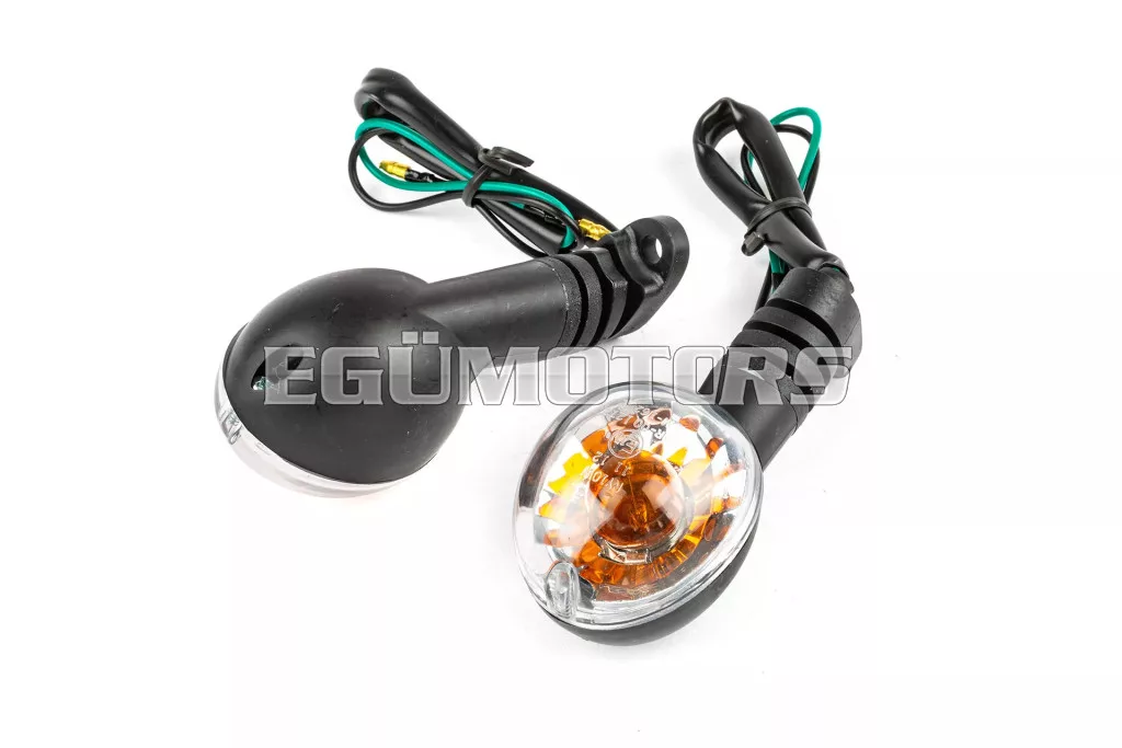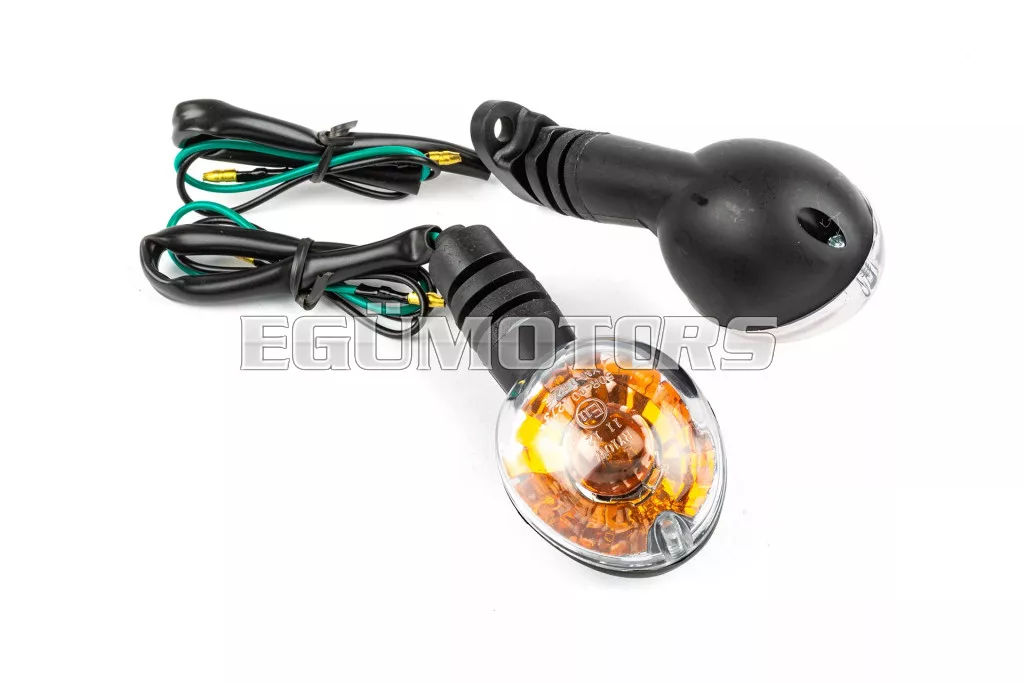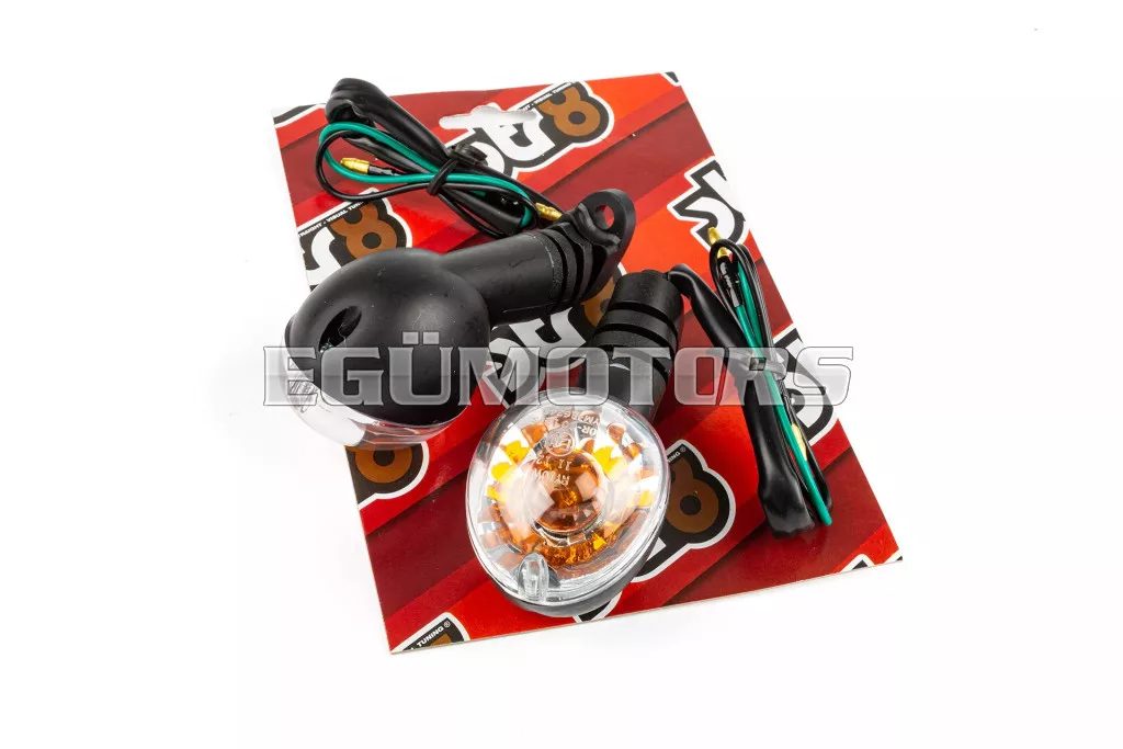 OEM standard index fekete / fehér színben, alkalmas Peugeot Ludix modellekhez, az eredeti irányjelzőkhöz hasonló kialakítással, első vagy hátsó felszereléshez.