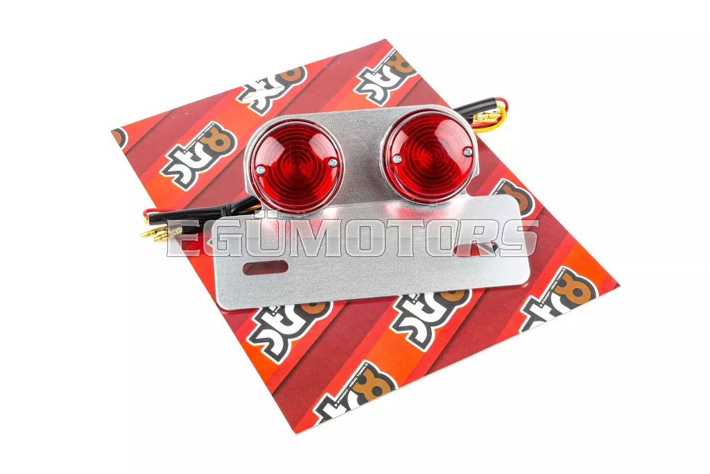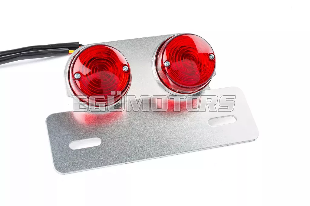 Elegáns megoldás supermotard vagy moped hátsó részére: kör alakú hátsó lámpa piros, ezüst rendszámtartóval.