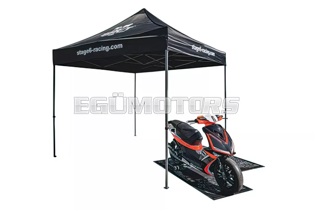 A Stage6 versenysátor a versenycsapatok és pilóták számára kötelező darab, tökéletes csapatbázis, jól látható találkozási pont, pihenőhely a fáradt versenyzőknek, takarás a kíváncsi tekintetek elől, egyedi motorok bemutatására, valamint természetesen időjárás elleni védelemre és felszerelések tárolására szolgál. A professzionális Stage6 sátor robusztus, stabil, vízálló és nagy terhelést is kibír. Néhány másodperc alatt felállítható és ugyanilyen gyorsan lebontható.