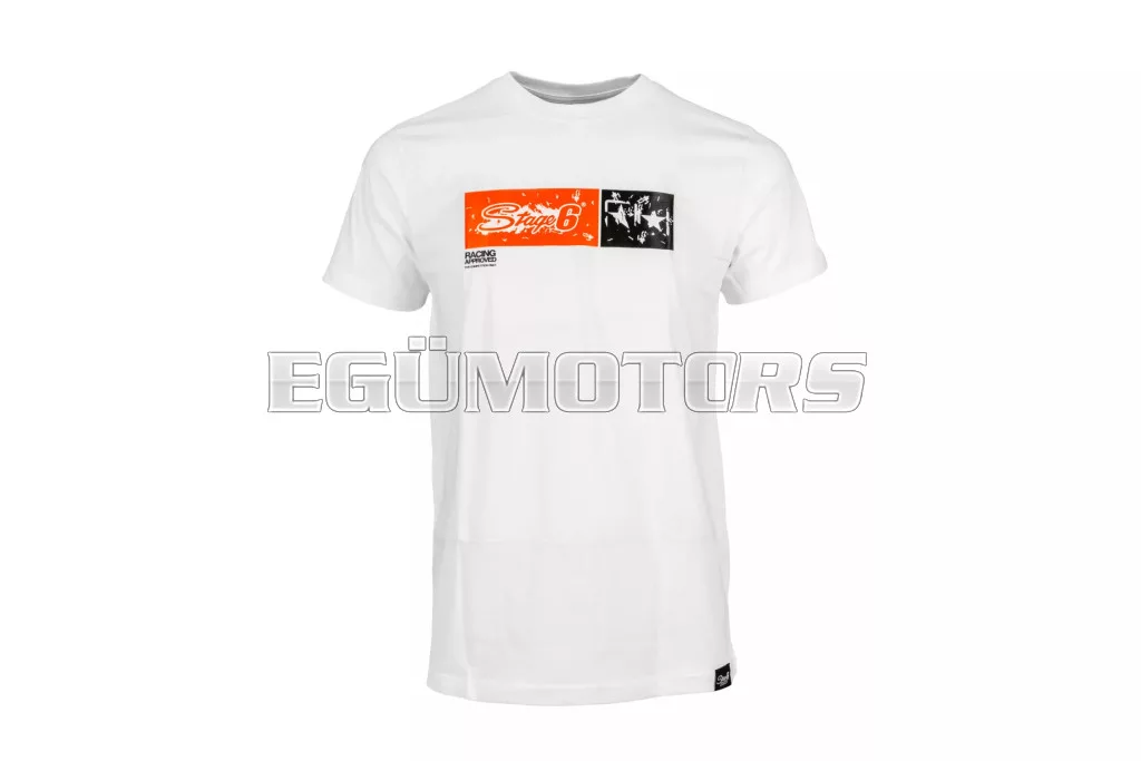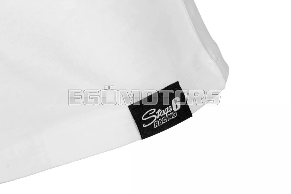 A normál szabású póló klasszikus férfi fazonnal rendelkezik, kerek nyakkivágással és bevarrt ujjakkal. Egy egyszerű egyszínű kivitel, a mellrészen és az alsó szegélyen elhelyezett Stage6 Racing Approved logóval.