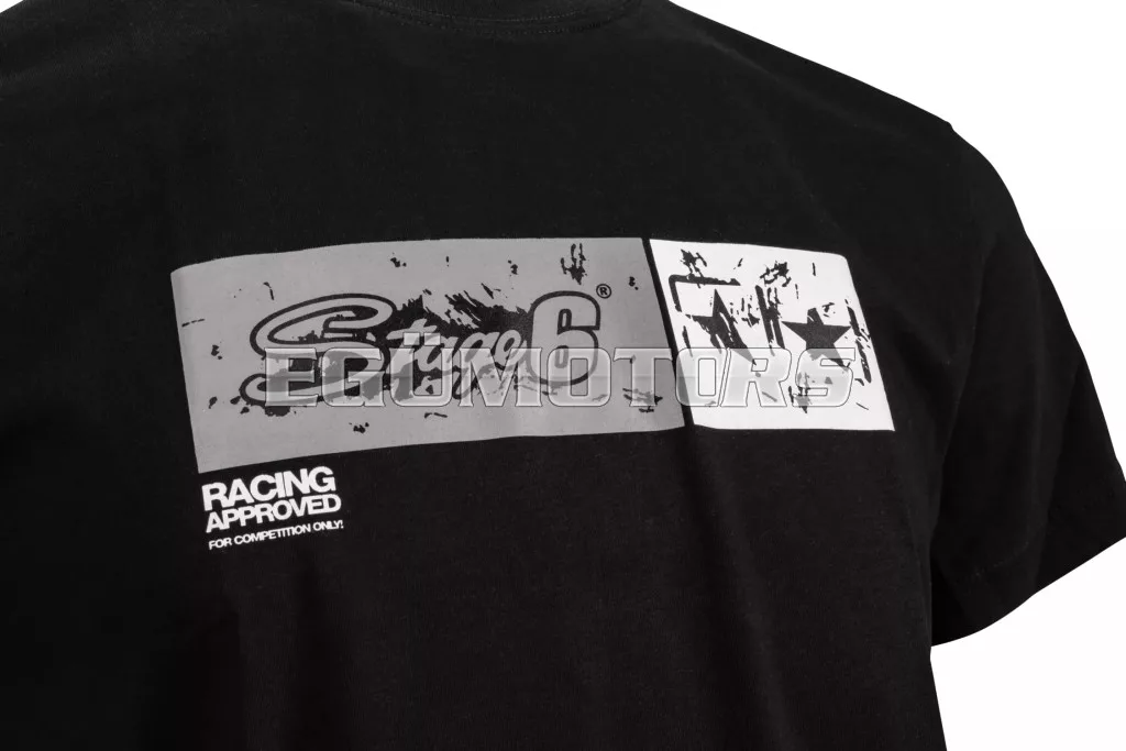 A normál szabású póló klasszikus férfi fazonnal rendelkezik, kerek nyakkivágással és bevarrt ujjakkal. Egy egyszerű egyszínű kivitel, a mellrészen és az alsó szegélyen elhelyezett Stage6 Racing Approved logóval.