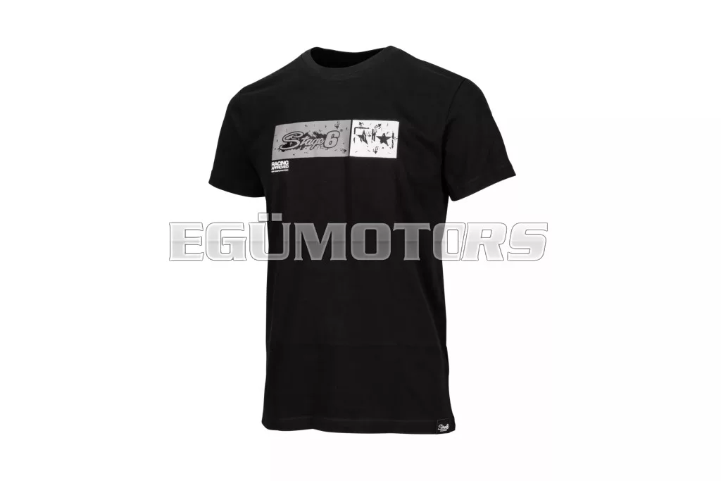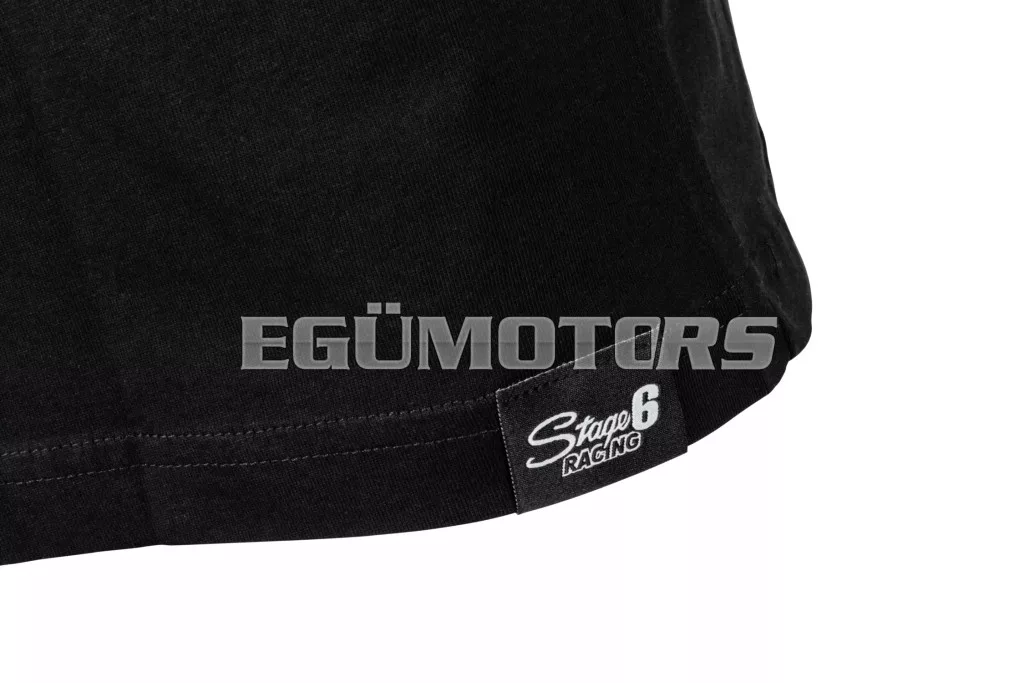 A normál szabású póló klasszikus férfi fazonnal rendelkezik, kerek nyakkivágással és bevarrt ujjakkal. Egy egyszerű egyszínű kivitel, a mellrészen és az alsó szegélyen elhelyezett Stage6 Racing Approved logóval.