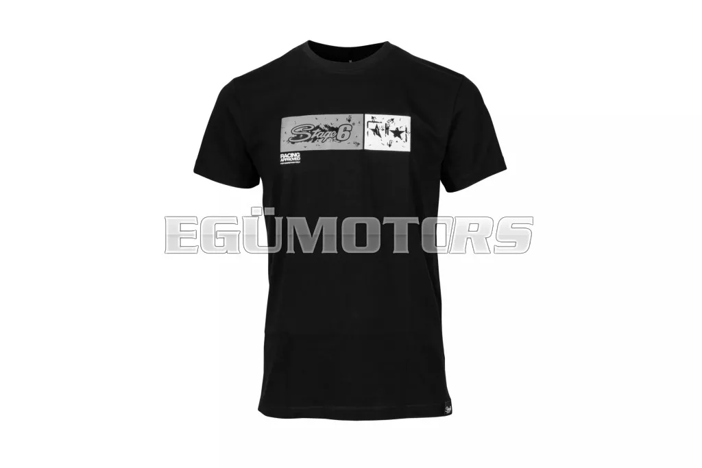 A normál szabású póló klasszikus férfi fazonnal rendelkezik, kerek nyakkivágással és bevarrt ujjakkal. Egy egyszerű egyszínű kivitel, a mellrészen és az alsó szegélyen elhelyezett Stage6 Racing Approved logóval.