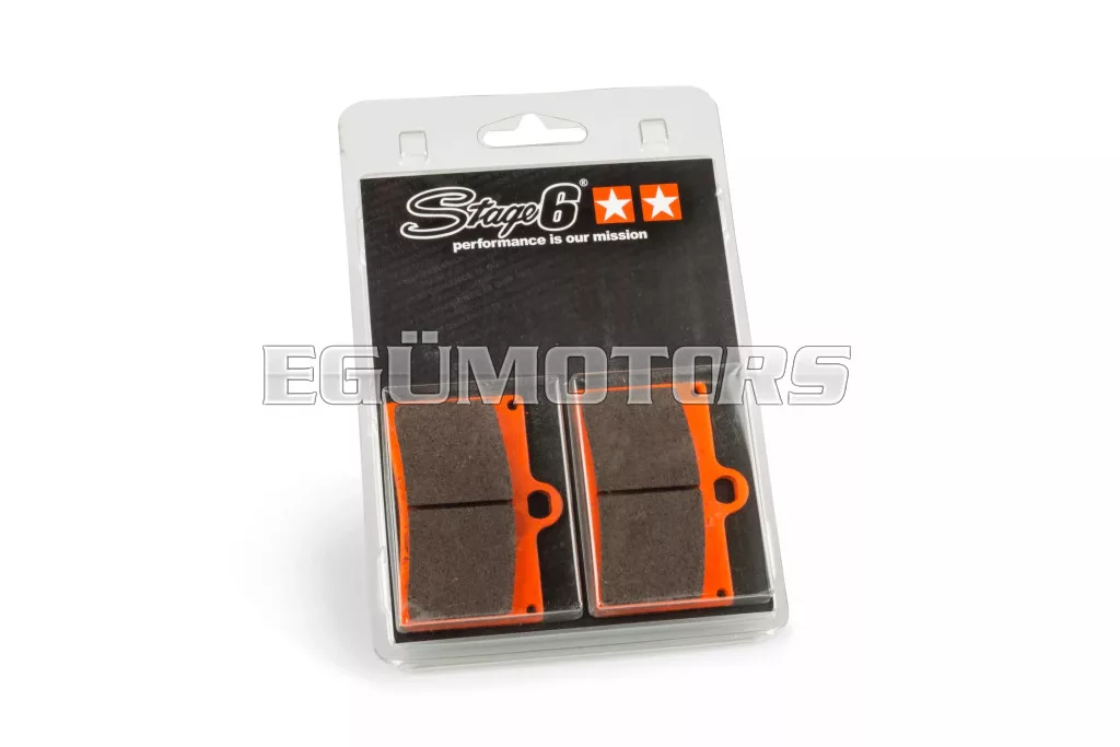 A Stage6 RACING fékbetétek a megfelelő választás mindazok számára, akik szeretik a gyors és „vad” stílust, de nem akarnak lemondani a biztonságról és a kiváló fékerőről. Minél erősebb a motor, annál fontosabb a minőségi fékbetét használata. Ezek a szinterezett fém fékbetétek kiváló fékteljesítményt és azonnali reakciót (harapást) biztosítanak, lehetővé téve a gyors és erőteljes fékezést még kedvezőtlen körülmények között is (pl. nedves vagy sáros pálya stb.). Az erős és sokoldalú fékbetétek már az első pillanattól kezdve érezhetően jobb fékteljesítményt nyújtanak.