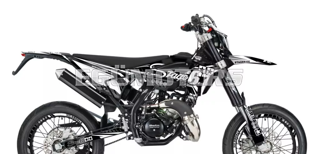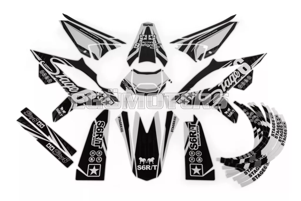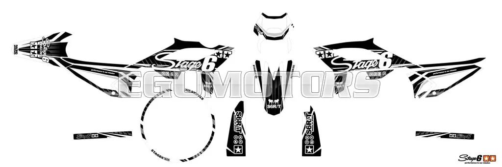 A Stage6 szett egyes matricái pontosan az adott modellhez vannak kivágva, és tökéletesen illeszkednek a burkolatok formájához. Az oldalidomokon található fehér felület rajtszám elhelyezésére szolgál (mint a motocross motorokon).