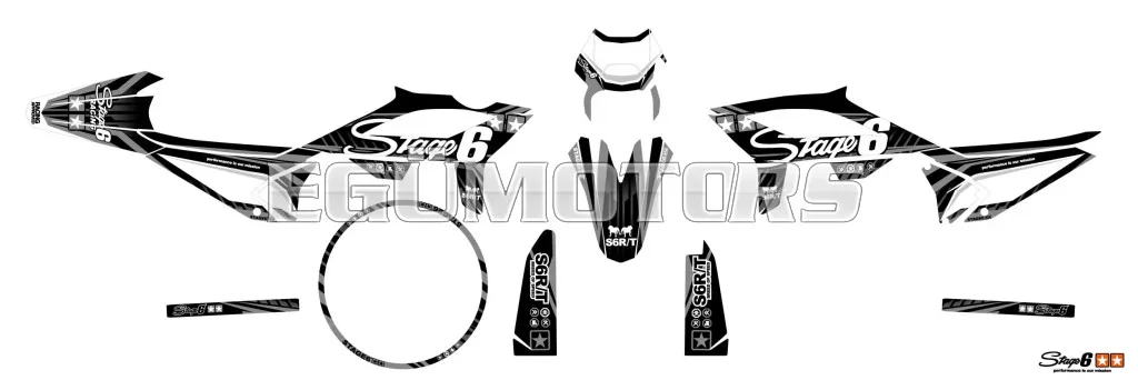 A Stage6 szett egyes matricái pontosan az adott modellhez vannak kivágva, és tökéletesen illeszkednek a burkolatok formájához. Az oldalidomokon található fehér felület rajtszám elhelyezésére szolgál (mint a motocross motorokon).