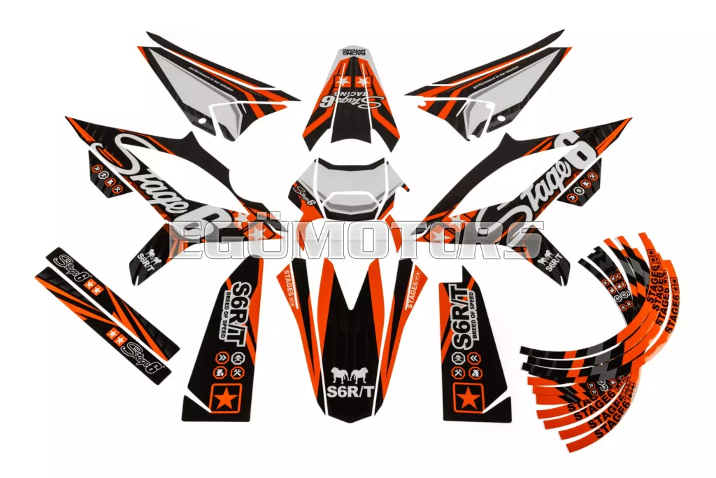 A Stage6 szett egyes matricái pontosan az adott modellhez vannak kivágva, és tökéletesen illeszkednek a burkolatok formájához. Az oldalidomokon található fehér felület rajtszám elhelyezésére szolgál (mint a motocross motorokon).