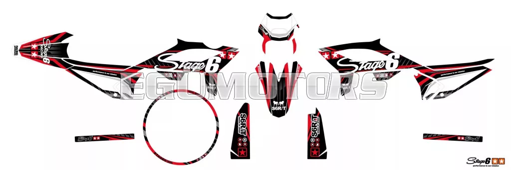 A Stage6 szett egyes matricái pontosan az adott modellhez vannak kivágva, és tökéletesen illeszkednek a burkolatok formájához. Az oldalidomokon található fehér felület rajtszám elhelyezésére szolgál (mint a motocross motorokon).