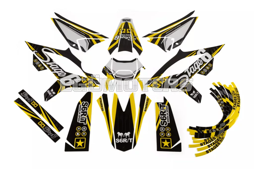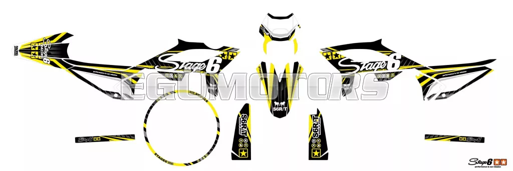 A Stage6 szett egyes matricái pontosan az adott modellhez vannak kivágva, és tökéletesen illeszkednek a burkolatok formájához. Az oldalidomokon található fehér felület rajtszám elhelyezésére szolgál (mint a motocross motorokon).