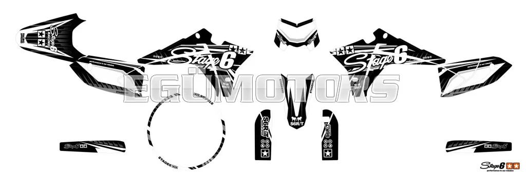 A Stage6 szett egyes matricái pontosan az adott modellhez vannak kivágva, és tökéletesen illeszkednek a burkolatok formájához. Az oldalidomokon található fehér felület rajtszám elhelyezésére szolgál (mint a motocross motorokon).