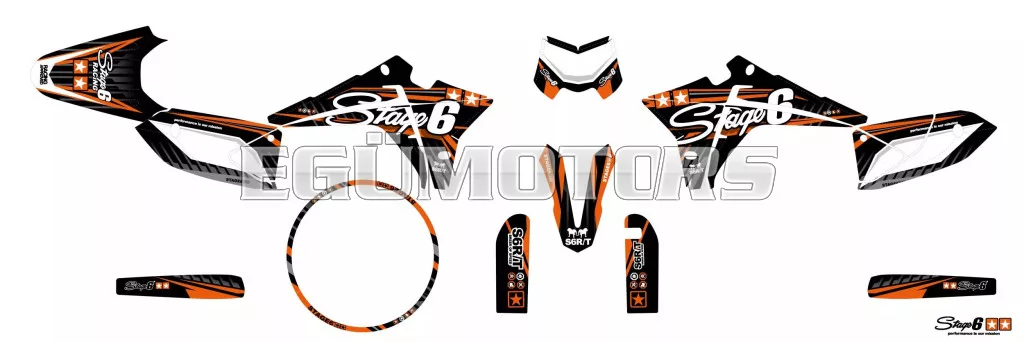 A Stage6 szett egyes matricái pontosan az adott modellhez vannak kivágva, és tökéletesen illeszkednek a burkolatok formájához. Az oldalidomokon található fehér felület rajtszám elhelyezésére szolgál (mint a motocross motorokon).