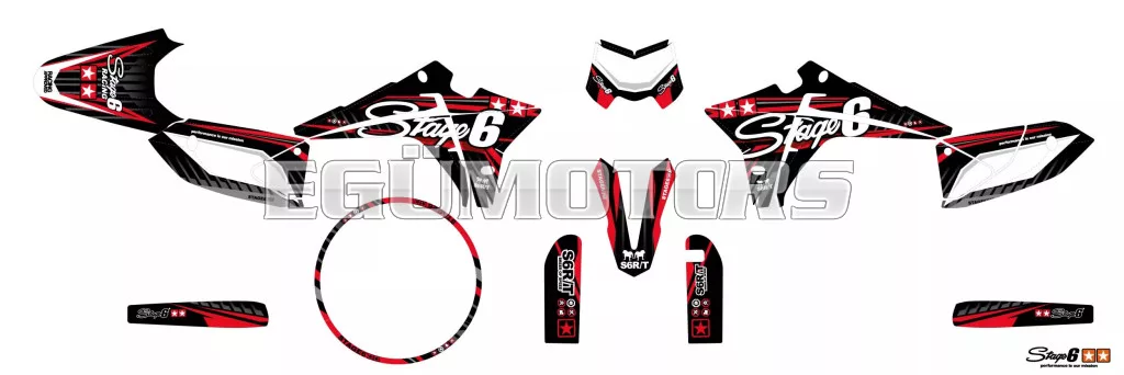 A Stage6 szett egyes matricái pontosan az adott modellhez vannak kivágva, és tökéletesen illeszkednek a burkolatok formájához. Az oldalidomokon található fehér felület rajtszám elhelyezésére szolgál (mint a motocross motorokon).