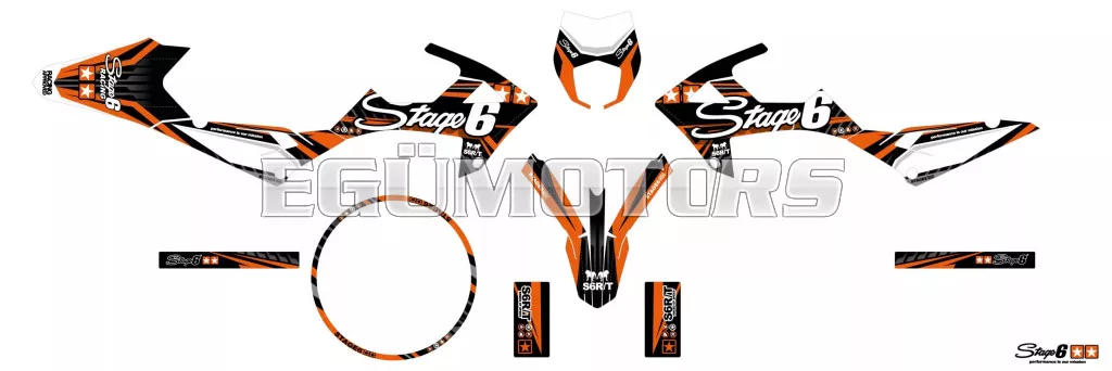 A Stage6 szett egyes matricái pontosan az adott modellhez vannak kivágva, és tökéletesen illeszkednek a burkolatok formájához. Az oldalidomokon található fehér felület rajtszám elhelyezésére szolgál (mint a motocross motorokon).