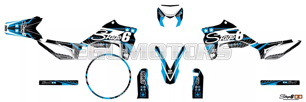 A Stage6 szett egyes matricái pontosan az adott modellhez vannak kivágva, és tökéletesen illeszkednek a burkolatok formájához. Az oldalidomokon található fehér felület rajtszám elhelyezésére szolgál (mint a motocross motorokon).