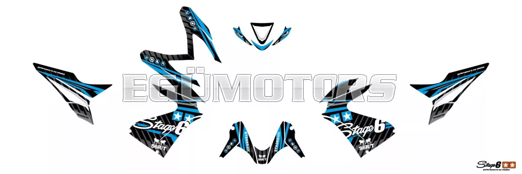 A Stage6 szett egyes matricái pontosan az adott modellhez vannak vágva, és tökéletesen illeszkednek a burkolatok formájához. Az oldalidomokon található fehér felület a rajtszám elhelyezésére szolgál (mint a motocross motorokon).