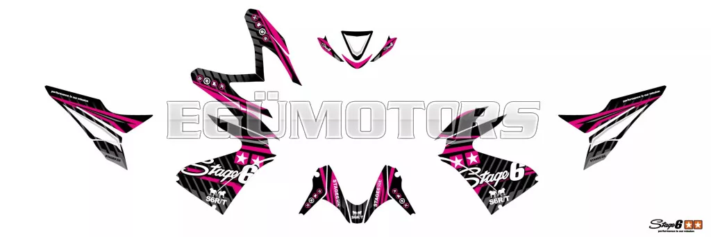 A Stage6 szett egyes matricái pontosan az adott modellhez vannak vágva, és tökéletesen illeszkednek a burkolatok formájához. Az oldalidomokon található fehér felület a rajtszám elhelyezésére szolgál (mint a motocross motorokon).