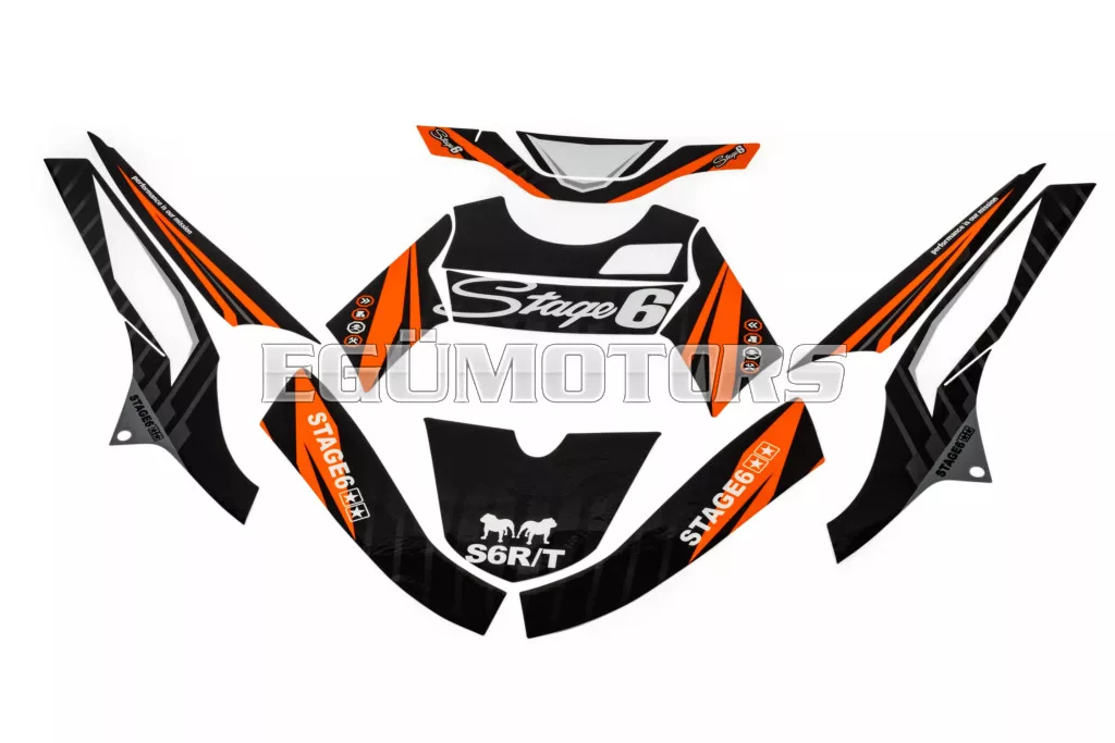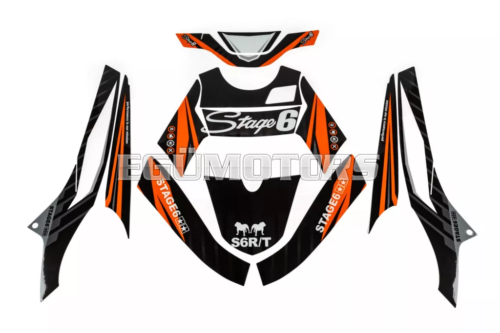 A Stage6 szett egyes matricái pontosan az adott modellhez vannak vágva, és tökéletesen illeszkednek a burkolatok formájához. Az oldalidomokon található fehér felület a rajtszám elhelyezésére szolgál (mint a motocross motorokon).