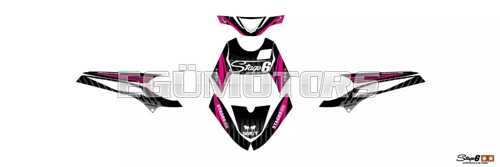 A Stage6 szett egyes matricái pontosan az adott modellhez vannak vágva, és tökéletesen illeszkednek a burkolatok formájához. Az oldalidomokon található fehér felület a rajtszám elhelyezésére szolgál (mint a motocross motorokon).