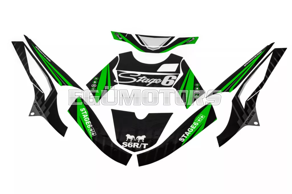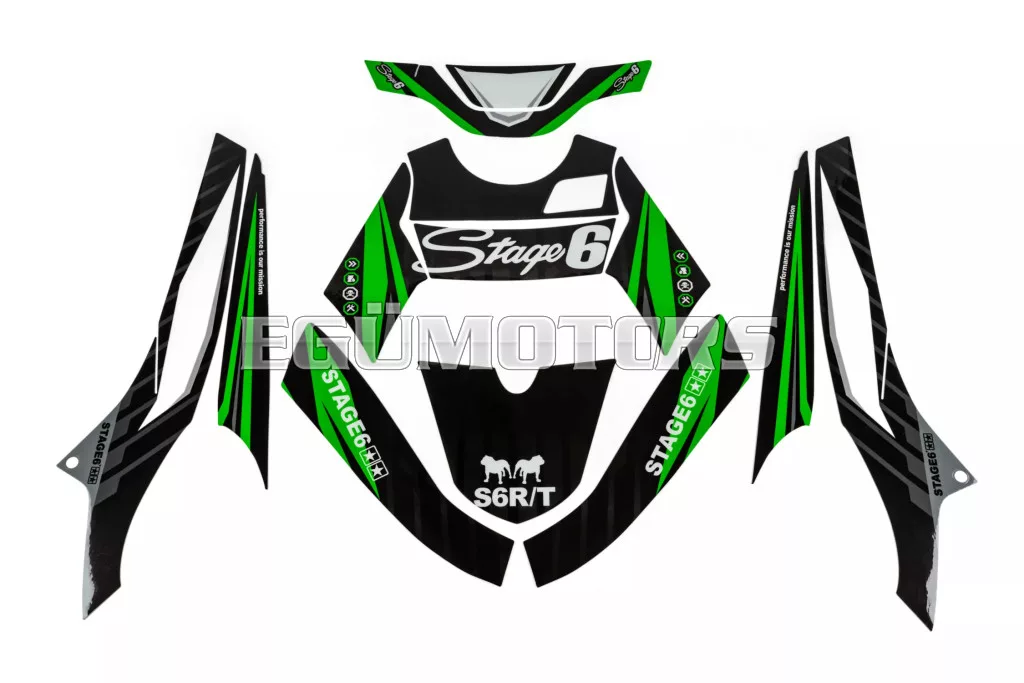 A Stage6 szett egyes matricái pontosan az adott modellhez vannak vágva, és tökéletesen illeszkednek a burkolatok formájához. Az oldalidomokon található fehér felület a rajtszám elhelyezésére szolgál (mint a motocross motorokon).