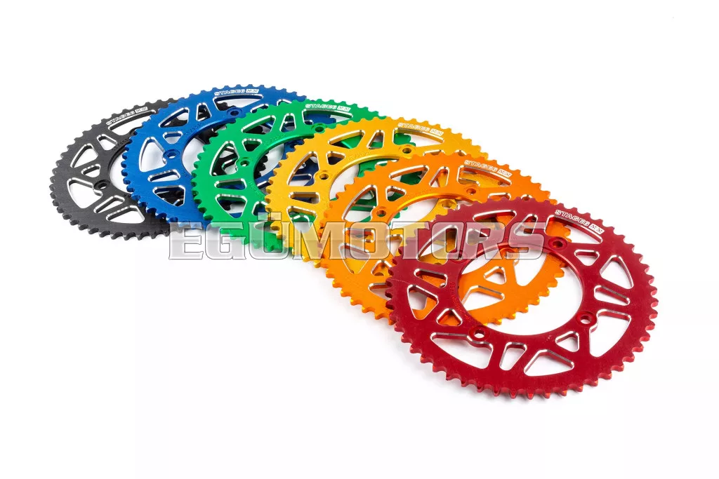A rendkívül robusztus, lánchajtásos mopedekhez készült lánckerekek kiváló minőségű alumíniumból CNC megmunkálással készülnek, majd eloxálással kapják meg végső felületüket. Európában gyártják.