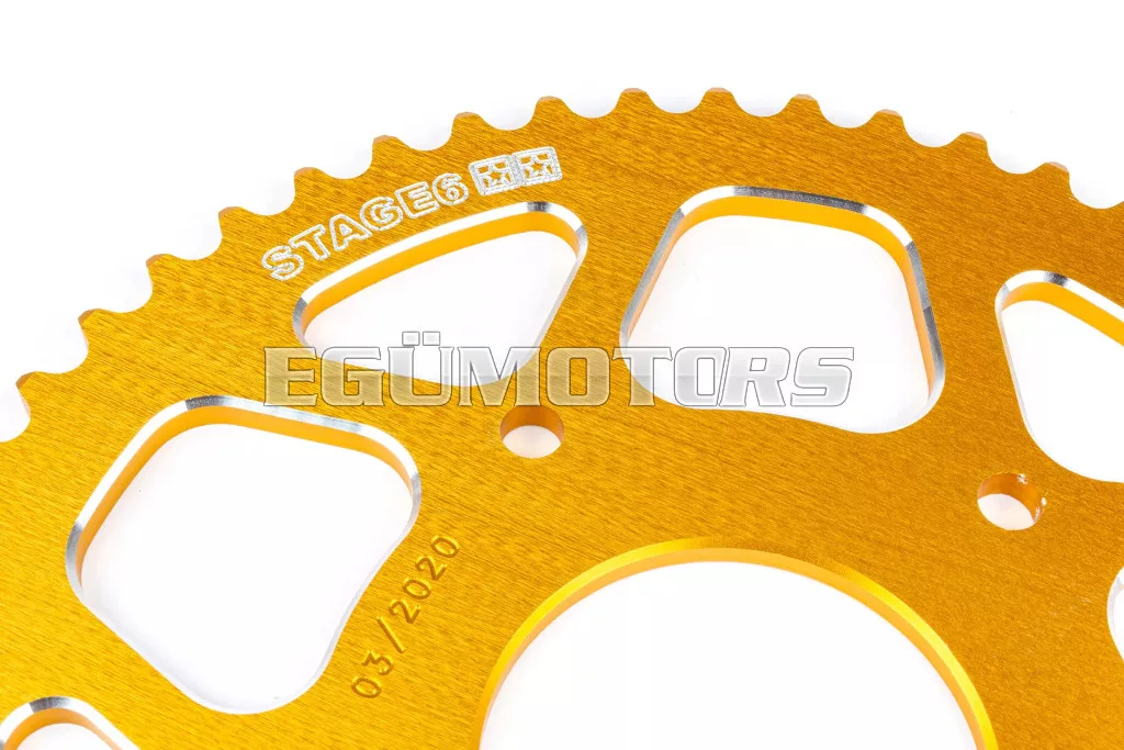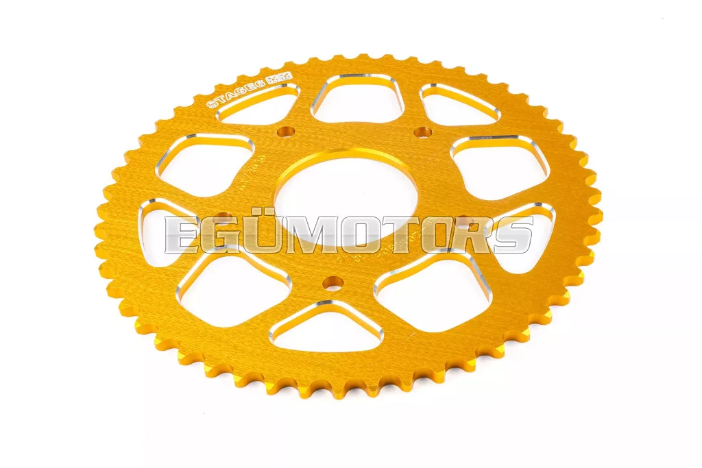 Prémium minőségű Stage6 hátsó lánckerék 53 foggal - 420-as alumínium CNC, Peugeot / Motorhispania modellekhez.