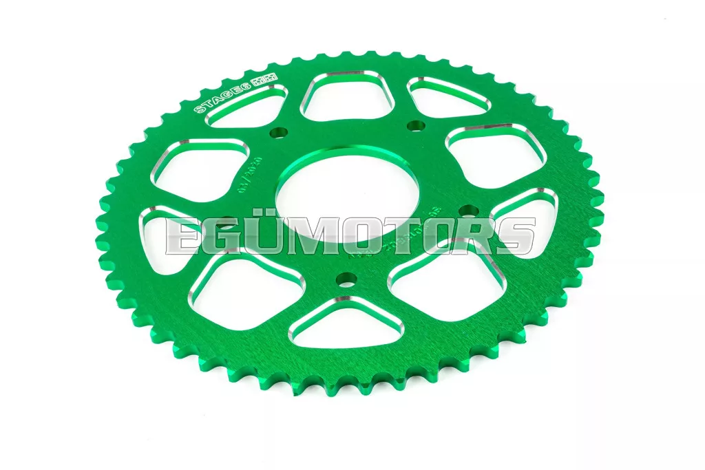 Prémium minőségű Stage6 hátsó lánckerék 53 foggal - 420-as alumínium CNC, Peugeot / Motorhispania modellekhez.