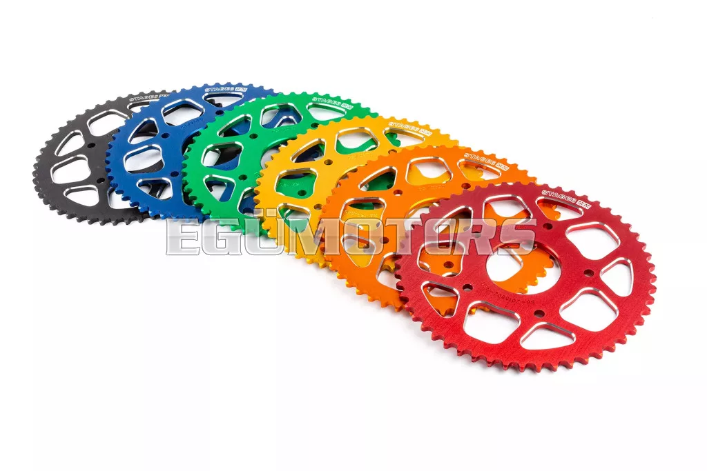 A rendkívül robusztus, lánchajtásos mopedekhez készült lánckerekek kiváló minőségű alumíniumból CNC megmunkálással készülnek, majd eloxált felületkezelést kapnak. Európában gyártják.