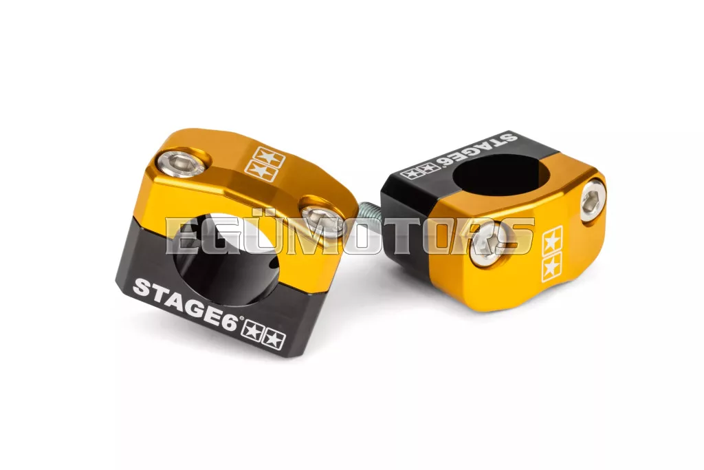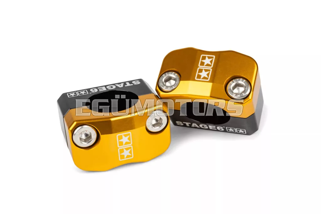 A kormánybilincsek CNC-megmunkáltak és színes eloxált felületűek, a felső részen (2 csillag), valamint az oldalakon (Stage6 logó) lézergravírozott logóval. Több színben is elérhetők.