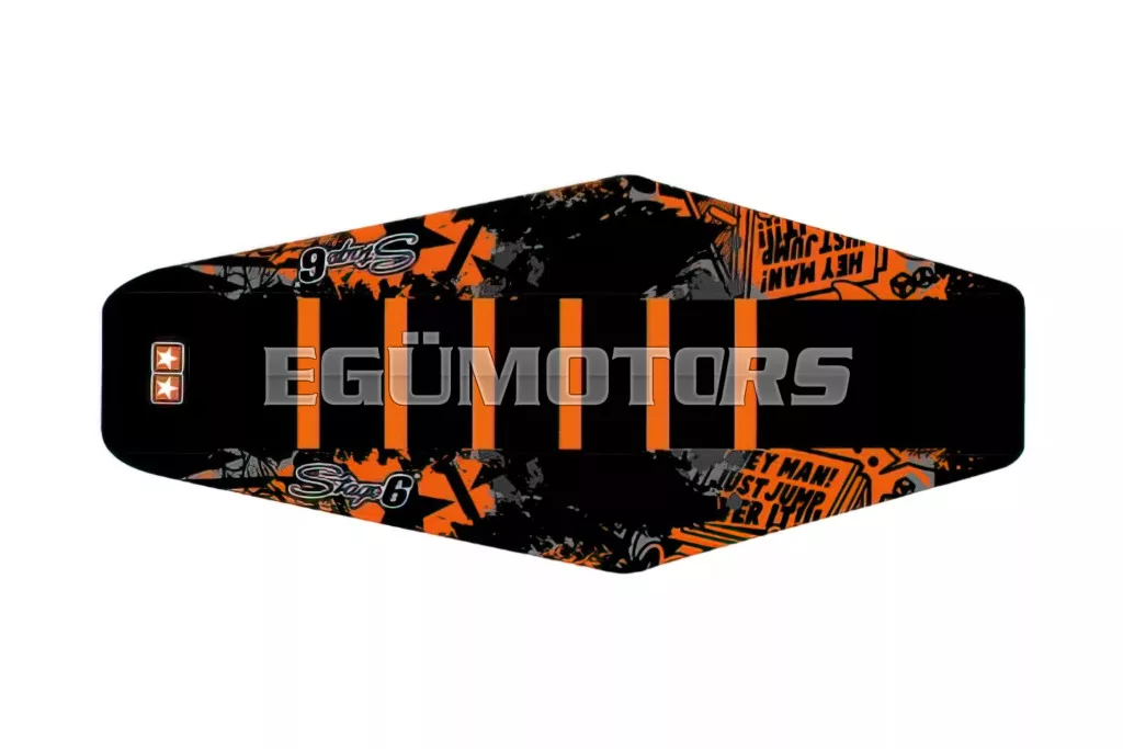 Az üléshuzatnak megfelelő tapadást kell biztosítania, hogy a vezető ne csússzon meg kanyarokban és gyorsítás közben, így a karok terhelése is csökken. Emellett a huzat hozzájárul a motor összképének javításához is. A Stage6 üléshuzatok mindkettőt biztosítják: kiváló tapadást és tartást a csúszásmentes felületnek és a 6 színes csíknak köszönhetően, valamint sportos off-road verseny megjelenést a Stage6 logóval és színes grafikával ellátott vinil oldalpanelek révén, amelyek tökéletesen illeszkednek a Stage6 idom matrica szettekhez.