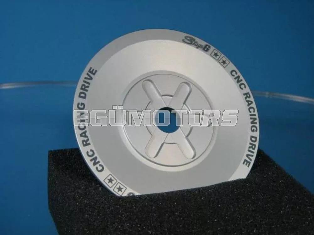 Stage6 variátor külső tárcsa, tuning alkatrész robogókhoz. Optimalizált kúpszöggel készült. Az originál külső tárcsák sok esetben anyagi okok miatt öntvények, vagy a legrosszabb esetben préseltek, ezért a lehűlés közben vetemedhetnek és így különbségek keletkeznek a varió és a külső tárcsa kúpszöge között. Versenymotorok számára amik egy igen keskeny fordulattartományban dolgoznak, ilyen kis különbségek már nagyban befolyásolhatják a teljesítményt.