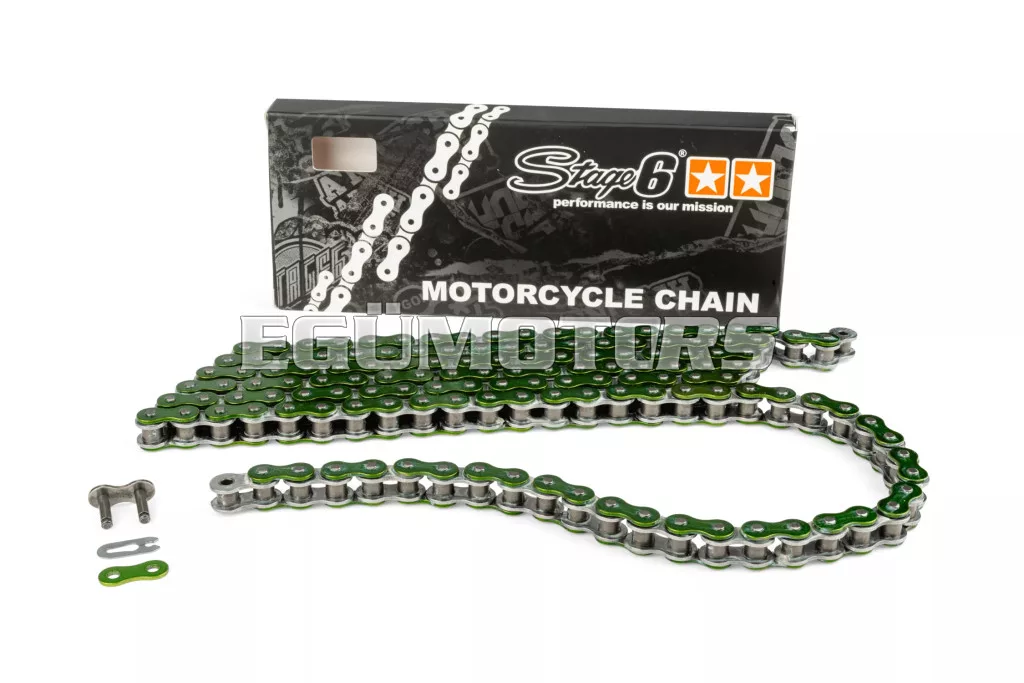 Kiváló minőségű Stage6 HQ (High Quality) motorkerékpár lánc. Többféle mutatós, feltűnő színben kapható, optikai tuningnak is kitűnő!