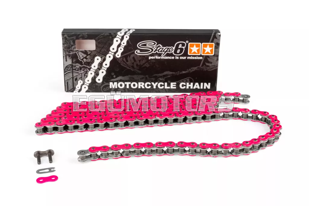 Kiváló minőségű Stage6 HQ (High Quality) motorkerékpár lánc. Többféle mutatós, feltűnő színben kapható, optikai tuningnak is kitűnő!
